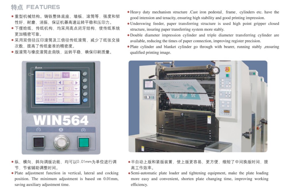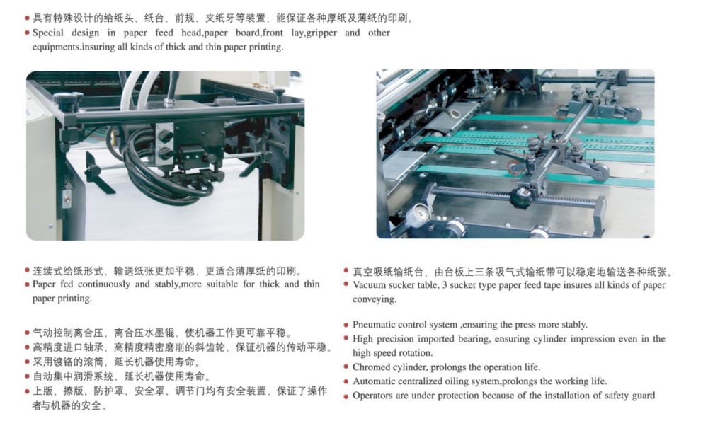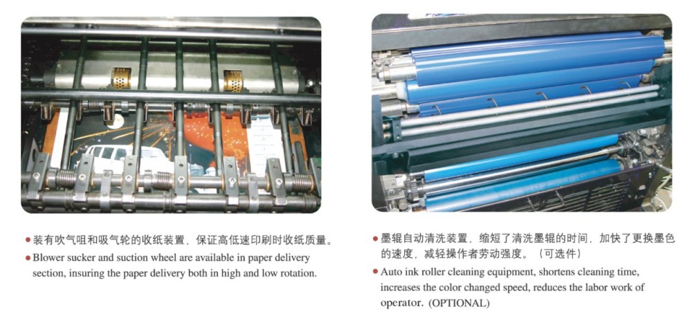Pokud jde o ofsetový tiskový stroj A2 pro čtyřbarevný malonákladový tisk, je vyroben s vysoce výkonnými moduly, díky kterým je spolehlivý – ideální pro malonákladové tiskové úlohy. Tyto moduly zahrnují vysoce přesné válečky a ozubená kola, robustní mechanismus podávání papíru, přesný systém registrace papíru a systém stabilního přívodu inkoustu. Splňuje požadavky trhu na barevný tisk samostatných listů, který je vysoce kvalitní, efektivní a nákladově efektivní, zejména pro krátkodobé úlohy. Dokáže zpracovat širokou škálu tlouštěk papíru – od 0,04 mm tenkého papíru po 0,4 mm tlustý karton. A díky dotykovému ovládání a intuitivnímu programovacímu rozhraní můžete snadno provádět chytré úpravy všech nastavení a parametrů tisku.
