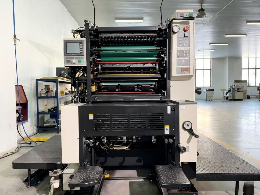 Toto je ofsetový tiskový stroj pro dvoubarevný tisk štítků A2. Je určen pro malé až střední výrobní série. Vše je o efektivitě a snadném použití. Může tisknout dvě barvy na jeden průchod papíru. To šetří čas a práci. Má rychlé polohovací a napínací zařízení pro montáž na desku. Tím se zkracuje doba změny. K dispozici je také poloautomatický systém čištění inkoustových válečků, který urychluje změny barev a ulehčuje práci operátora. Tisk má kontinuální systém podávání papíru. Je spárován s vakuovým sacím stolem a třemi otočnými transportními pásy. Toto nastavení dobře zvládá různé tloušťky papíru. Dvojité pružinové chapadla zabraňují sklouznutí papíru. To je klíčové pro vysokorychlostní tisk. Má i praktické vlastnosti. Věci jako alkoholové vlhčení a automatické nastavení objemu vody. Má také kvalitní podávání papíru se vzduchovými tryskami a sacími kolečky.