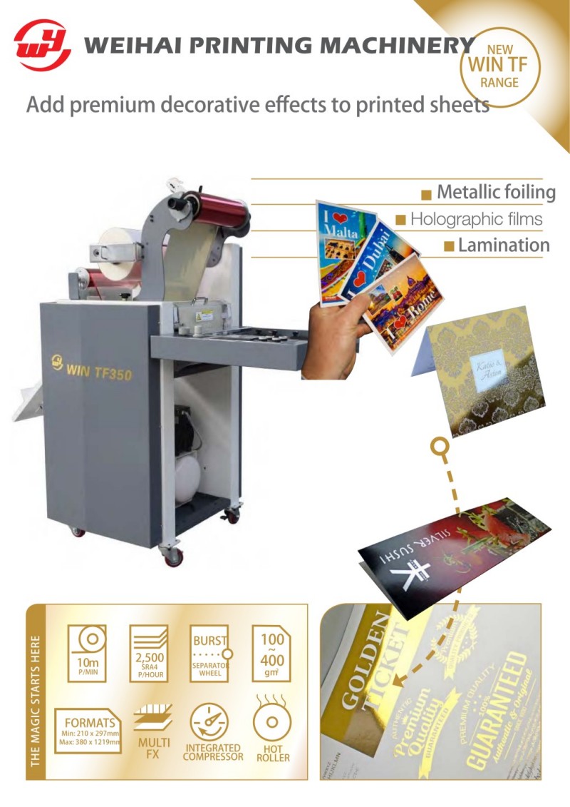 WIN poskytuje profesionální laminovací a fóliovací stroj (TF350/ATF380), nazývaný také laminovací a fóliovací stroj bez výroby desek, který se bezproblémově propojuje s digitálním tiskovým strojem a archovým digitálním inkoustovým tiskovým strojem. Toto vysoce účinné post-pressové zařízení integruje funkce laminování, horké ražby a fóliování za studena. Dokáže nanášet lesklé, matné i laserové fólie, stejně jako precizní ražbu kovové fólie jedním průchodem. Díky přesné regulaci teploty a tlaku zajišťuje tento laminovací a fóliovací stroj efekty bez bublin, deformace a pevné ražení. Podporuje automatické podávání papíru, stabilní dopravu a vysoce přesnou registraci, což výrazně zlepšuje vzhled a přidanou hodnotu tištěných produktů. Odolný a snadno ovladatelný stroj na laminování a fólii je široce používán pro špičkové vizitky, dárkové krabičky, certifikáty, obaly knih a prémiové propagační materiály.